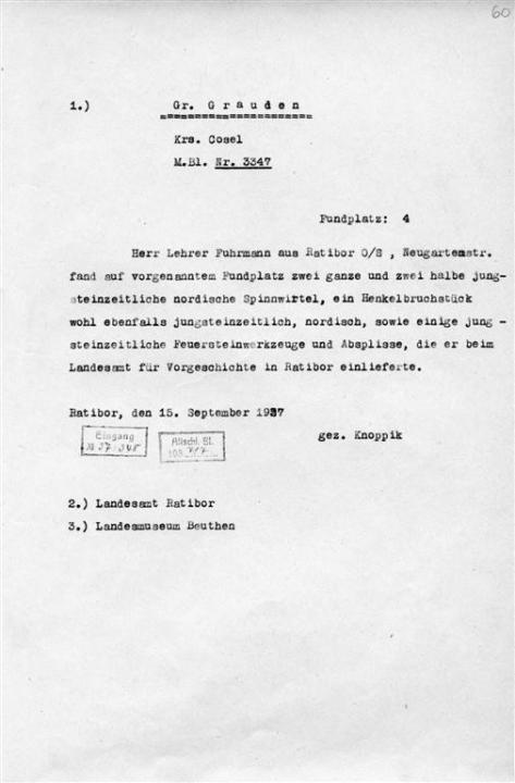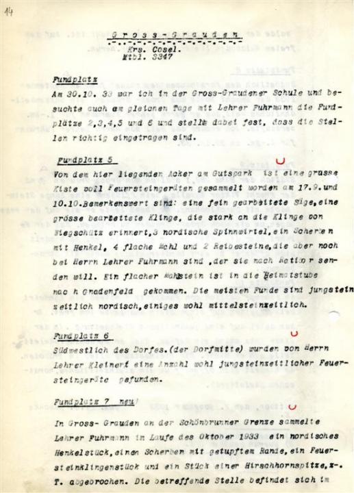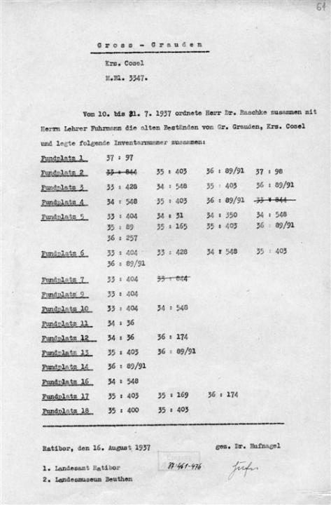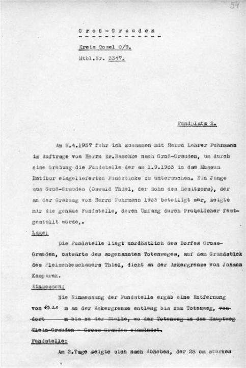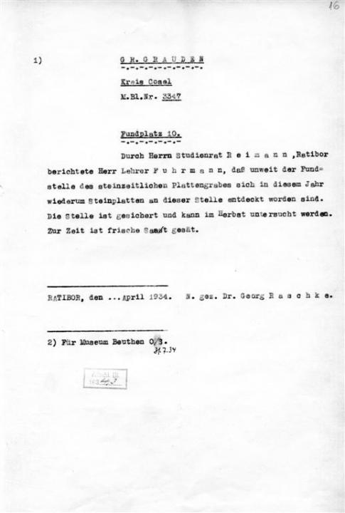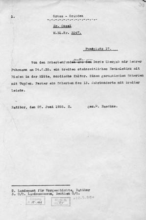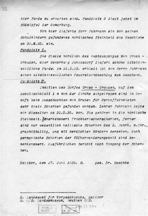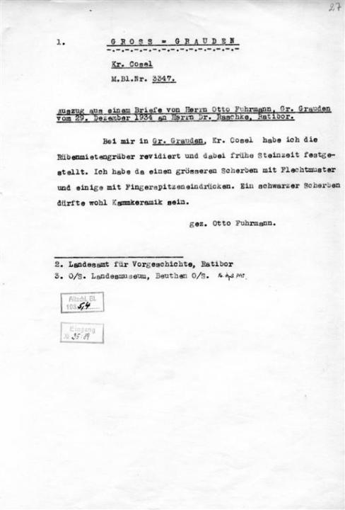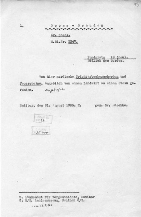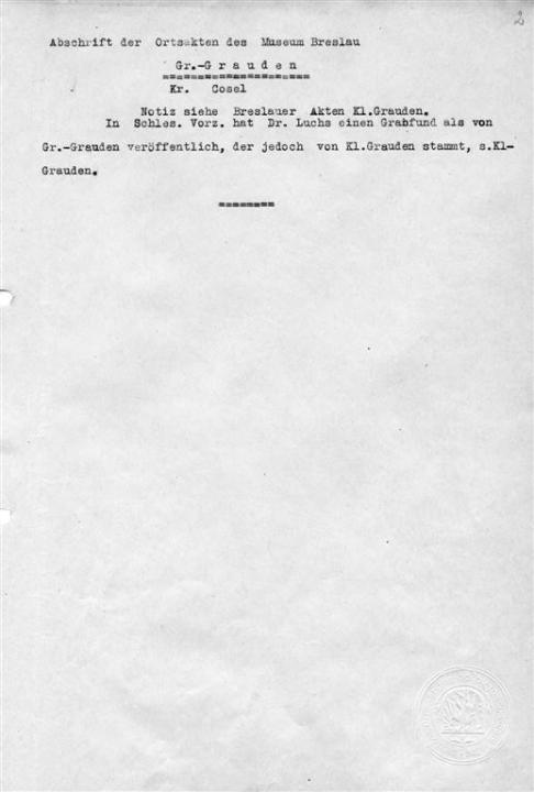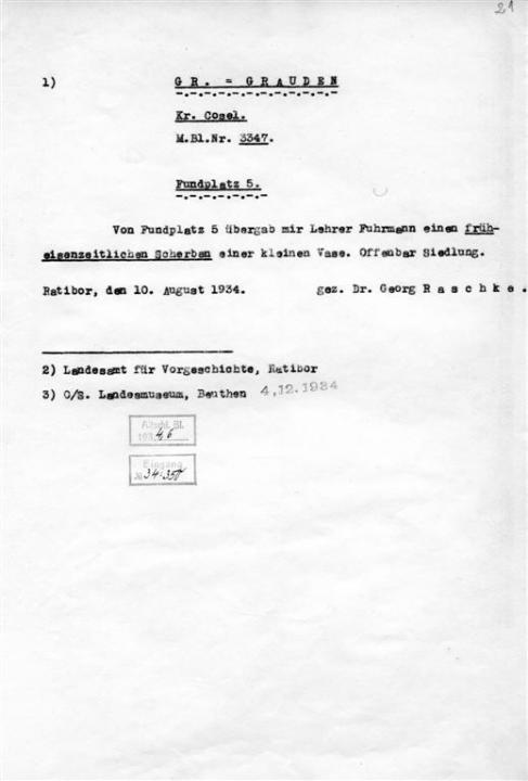 | Literatura: Altschlesische Blatter 1933, z. 5, s.91 (?) Altschlesische Blatter 1933, z. 6 Altschlesische Blatter 1934, z. 6 Altschlesische Blatter 1935, z. 6, s.151 (?) Altschlesische Blatter 1937, z. 7 J. Bukowska-Gedigowa - Kultura pucharów lejk. w dorzeczu górnej Odry |