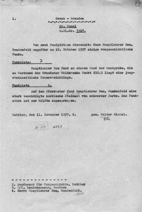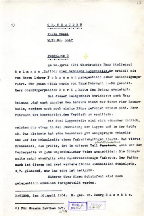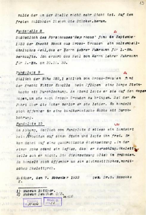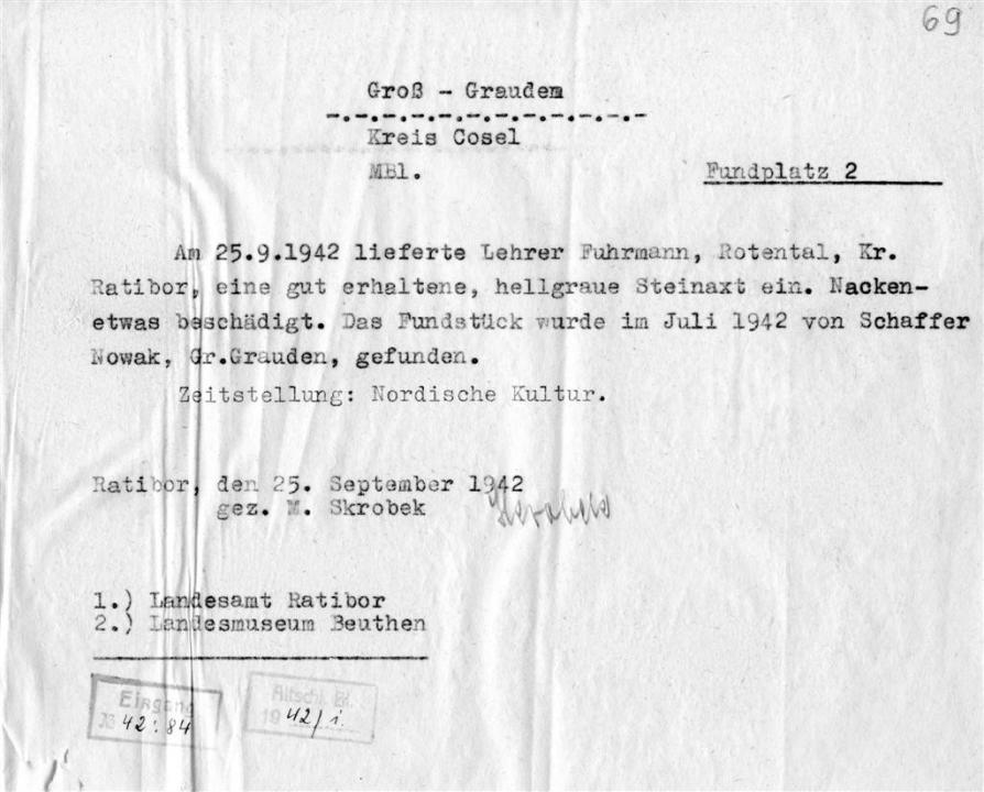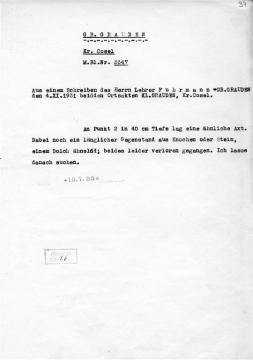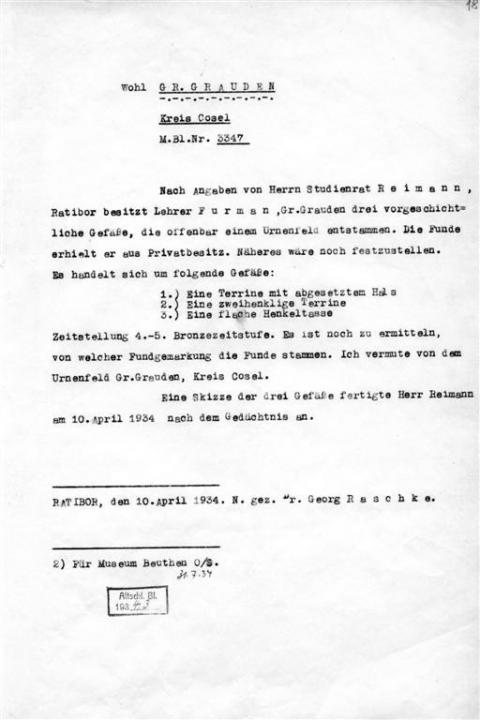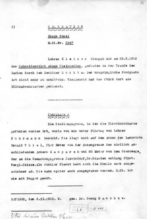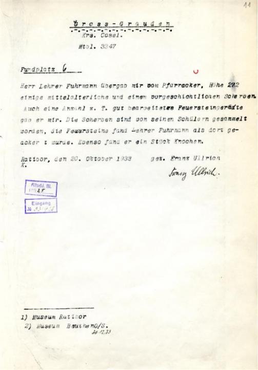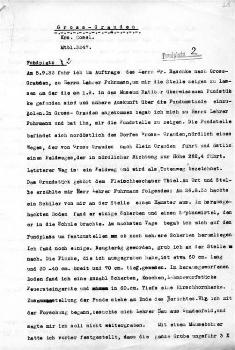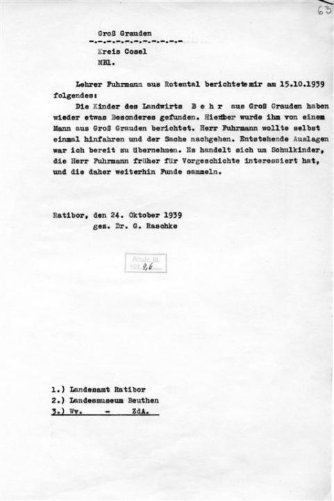 | Literatura: Altschlesische Blatter 1933, z. 5, s.91 (?) Altschlesische Blatter 1933, z. 6 Altschlesische Blatter 1934, z. 6 Altschlesische Blatter 1935, z. 6, s.151 (?) Altschlesische Blatter 1937, z. 7 J. Bukowska-Gedigowa - Kultura pucharów lejk. w dorzeczu górnej Odry |