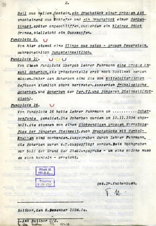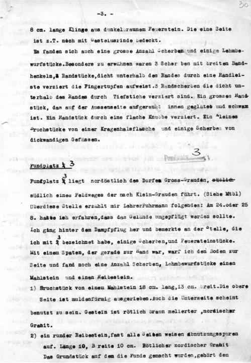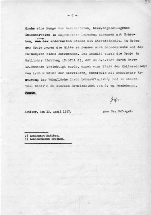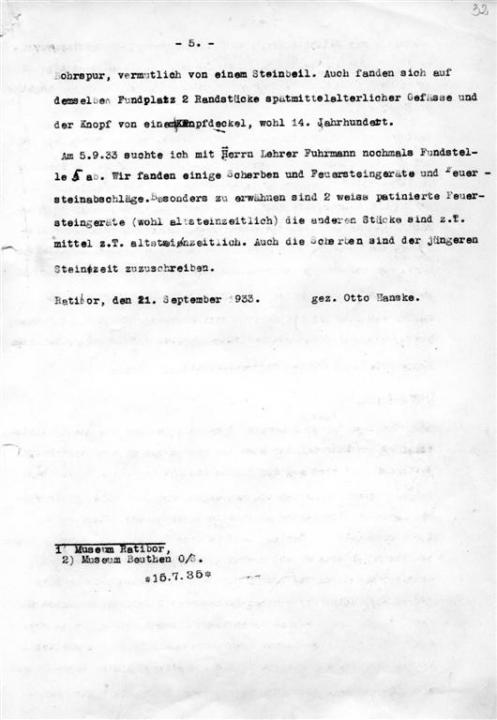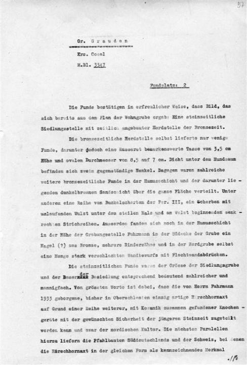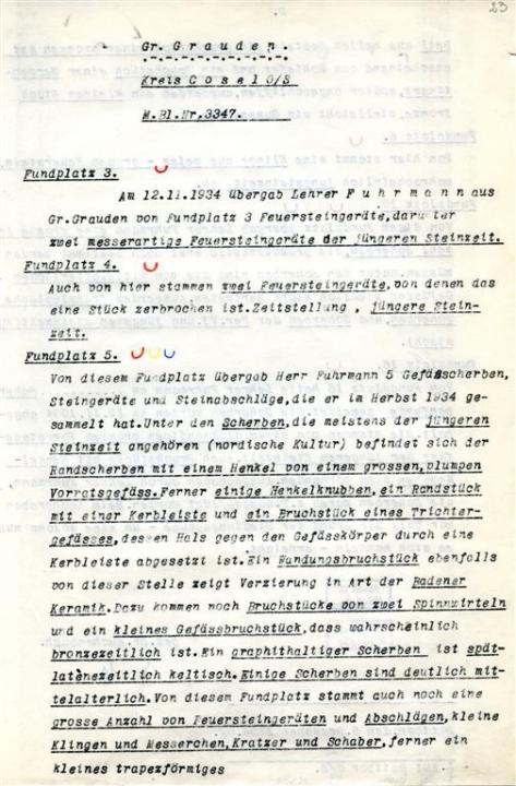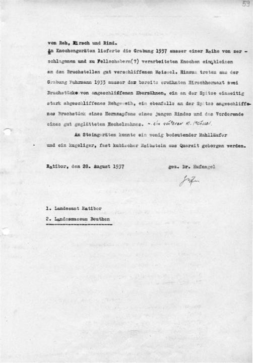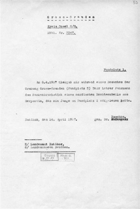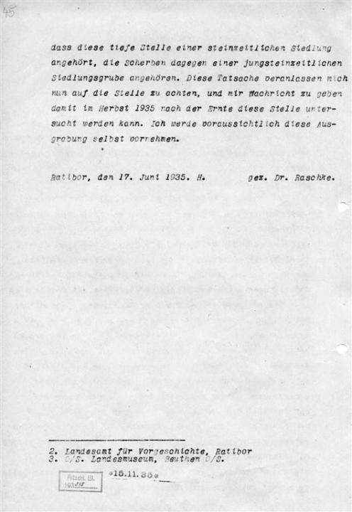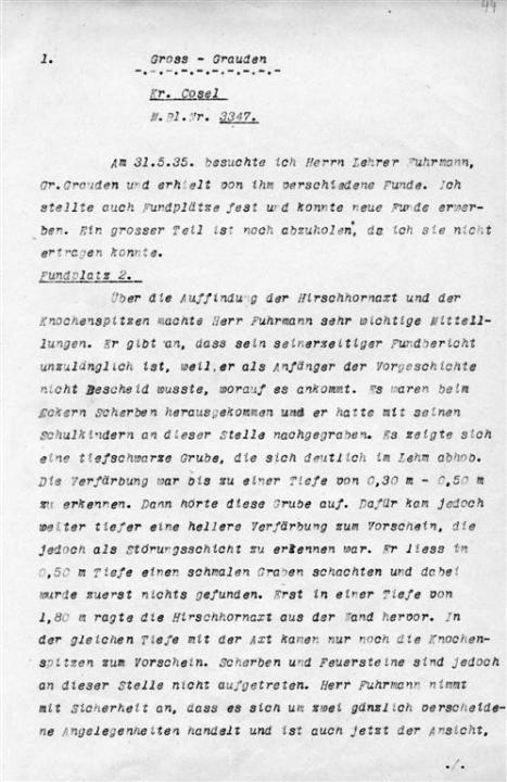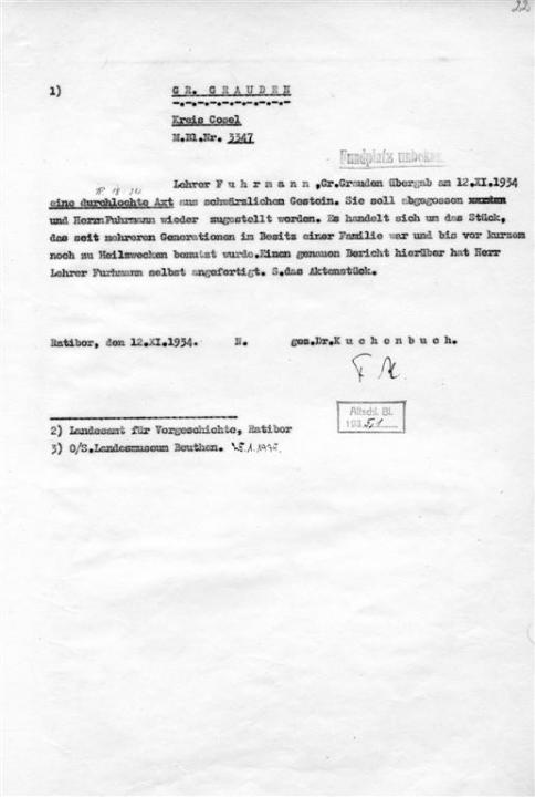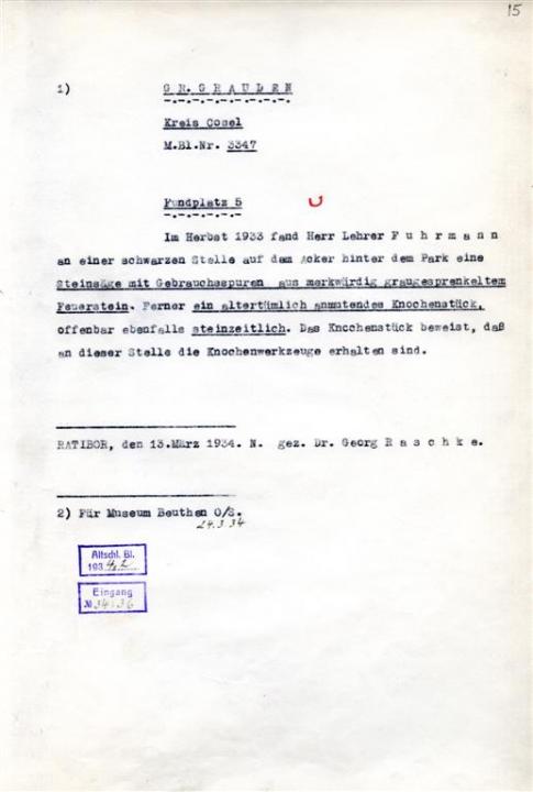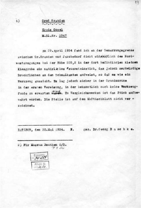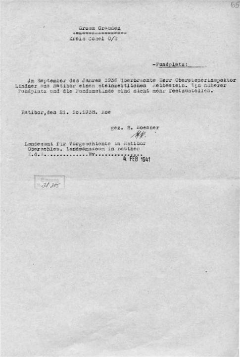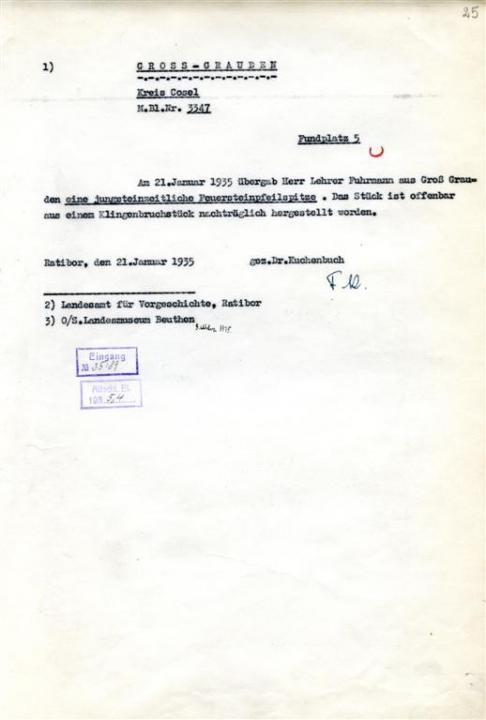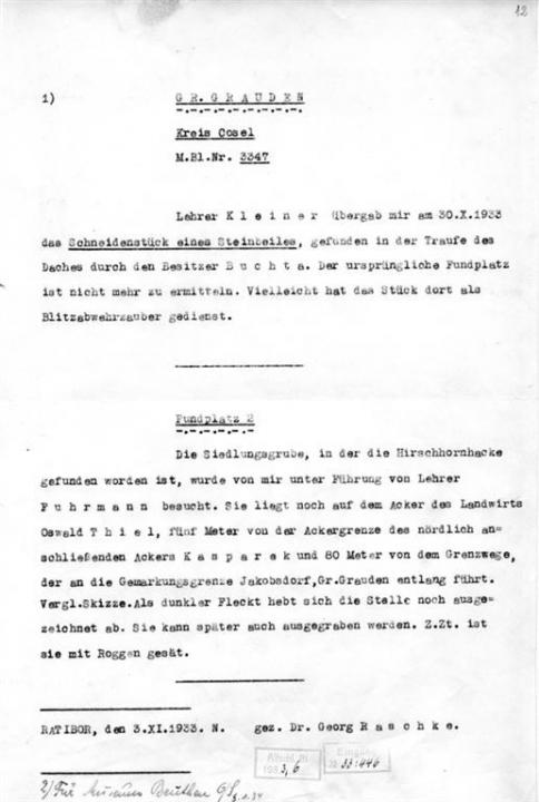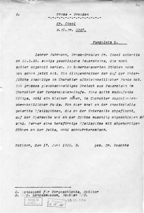 | Literatura: Altschlesische Blatter 1934, z. 6 Altschlesische Blatter 1935, z. 6, s.151(?) Altschlesische Blatter 1936, z. 2, s.64(?) Altschlesische Blatter 1937, z. 7 J. K. Kozłowski - Paleolit na Górnym Śląsku, s. 48 J. Bukowska-Gedigowa - Kultura pucharów lejk. w dorzeczu górnej Odry |