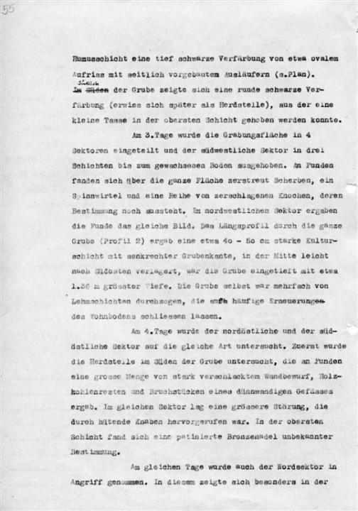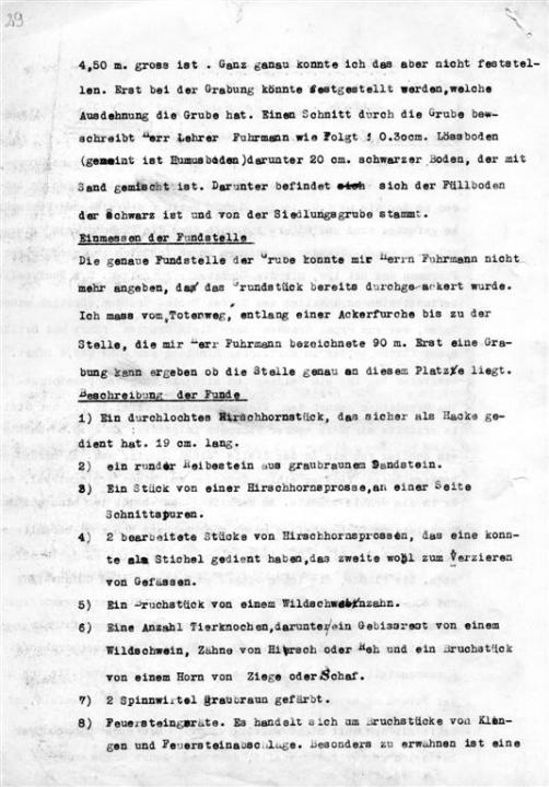 | 1933 - badania powierzchiowe nauczyciel Fuhrmann. 1934 - badania powierzchniowe nauczyciel Bau. 2001 - badania nie dostarczyły dalszych znalezisk. Materiały zaginęły. |