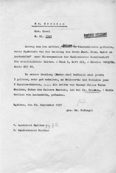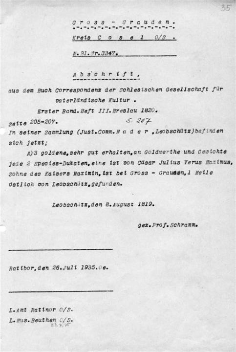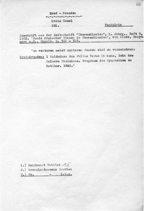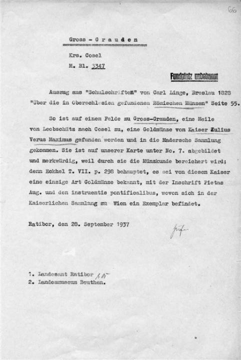| Moneta znaleziona została na polu przed 1820r. W 1822 znajdowała się w zbiorach Madera w Głubczycach. Był to aureus Juliusa Verusa Maximusa (przedziurawiony). Zaginęła. |