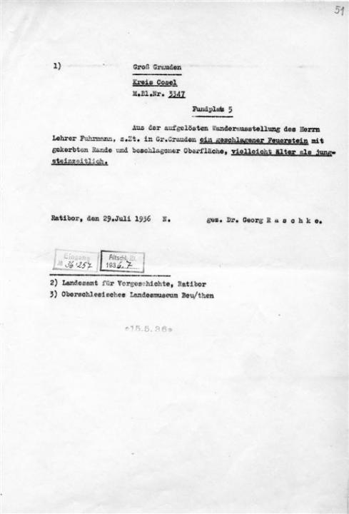 | 1934 - Badania powierzchniowe G.Raschkego i nauczyciela Fuhrmanna. Materiały przech. w: MSO Opole, nr inw.N-1373 |